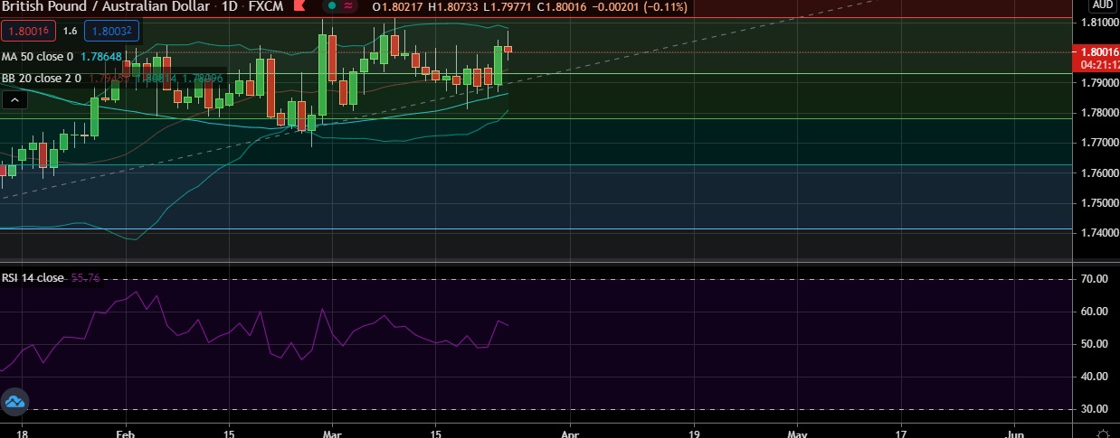•Strong support is seen at 1.7933 (38.2% fib) and break below could take the pair towards 1.7867 (50DMA).