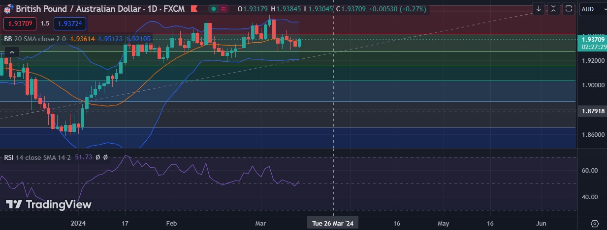 • Strong support is seen at 1.9271 (38.2% fib) and break below could take the pair towards 1.9217(Lower BB).