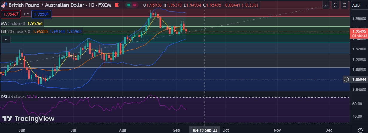 • Immediate support is seen at 1.9494 (50%fib) and break below could take the pair towards 1.9410(Lower BB).