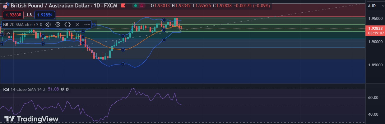 • Strong support is seen at 1.9211 (50% fib) and break below could take the pair towards 1.9166(Lower BB).