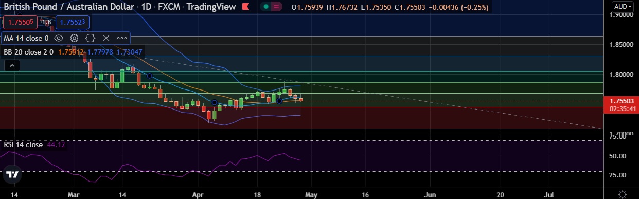 • Immediate support is seen at 1.7442 (23.6% fib) and break below could take the pair towards 1.7306 (Lower BB).