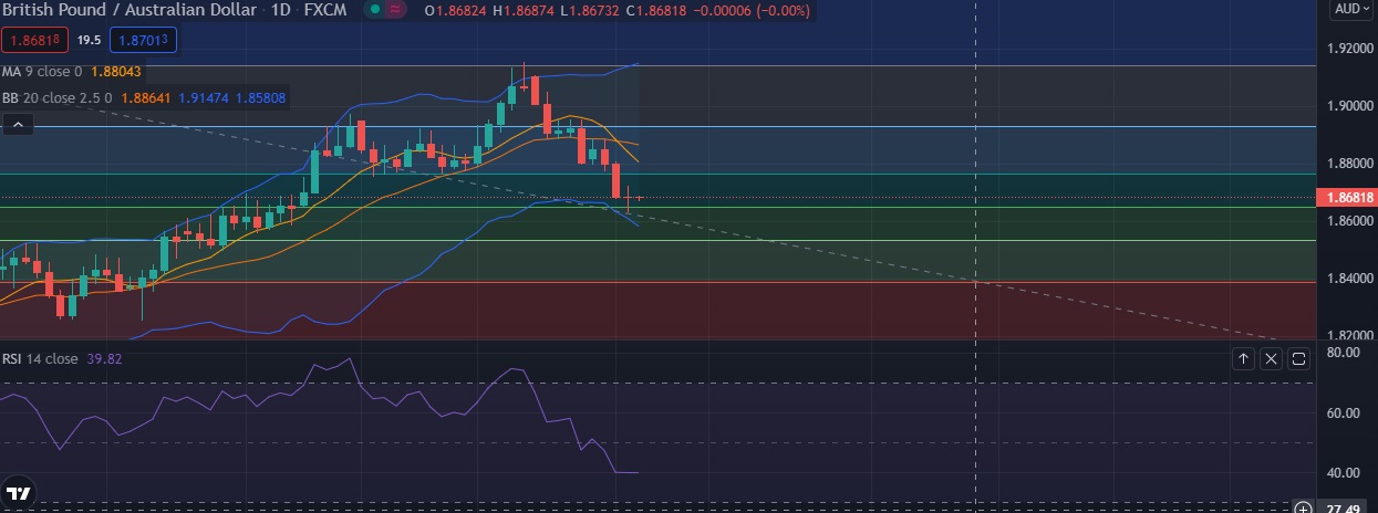 • Strong support is seen at 1.8632 (38.2%fib) and break below could take the pair towards 1.8577 (Lower BB).