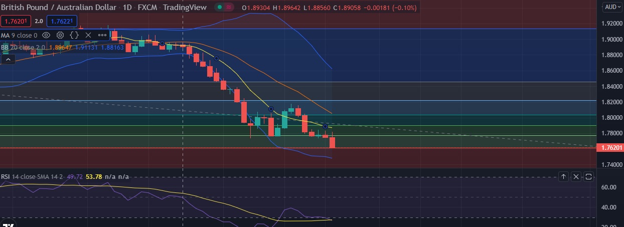 • Strong support is seen at 1.7613 (23.6%fib) and break below could take the pair towards 1.7498 (Lower BB).