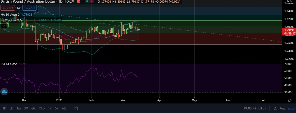 • Strong support is seen at 1.7900(30DMA) and break below could take the pair towards 1.7843 (23.6%fib).