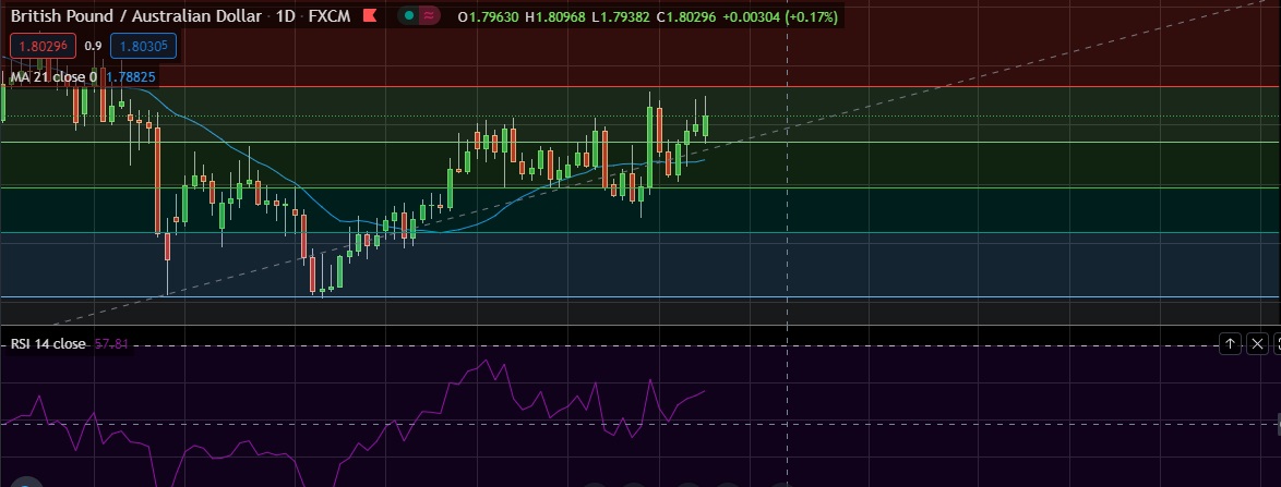 • Strong support is seen at 1.7949 (50%fib) and break below could take the pair towards 1.7875 (21DMA).
