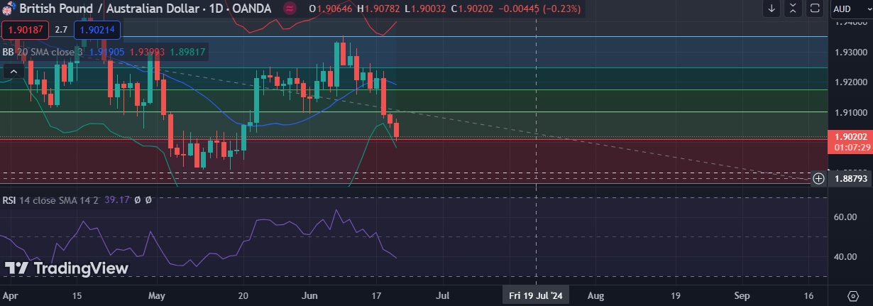 • Strong support is seen at 1.9010 (23.6%fib) and break below could take the pair towards 1.8980 (Lower BB )