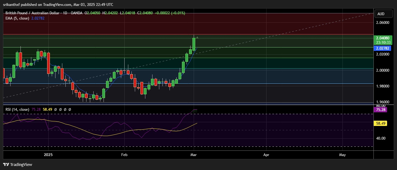 • GBP/ AUD strengthened on Monday as sterling firmed after European leaders agreed to draft a Ukraine peace plan for U.S. consideration and acknowledged the need to increase defense spending.