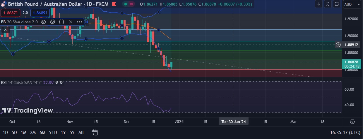 • Immediate support is seen at 1.8595(23.6%fib ), break below could take the pair towards 1.8569 (Lower BB).