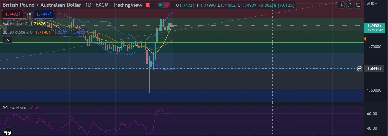 • The pair hit daily high at 1.7679 and was last trading at 1.7490 late in US session.