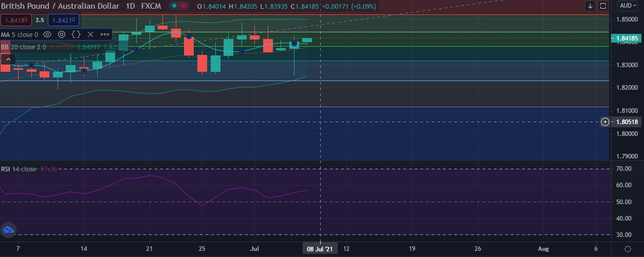 • Immediate resistance is located at 1.8444( 38.2%fib), any close above will push the pair towards 1.8500( Higher BB).