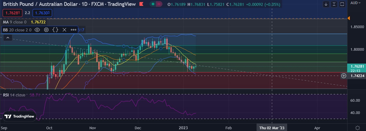 • Immediate support is seen at 1.7493 (23.6% fib) and break below could take the pair towards 1.7450 (Lower BB).