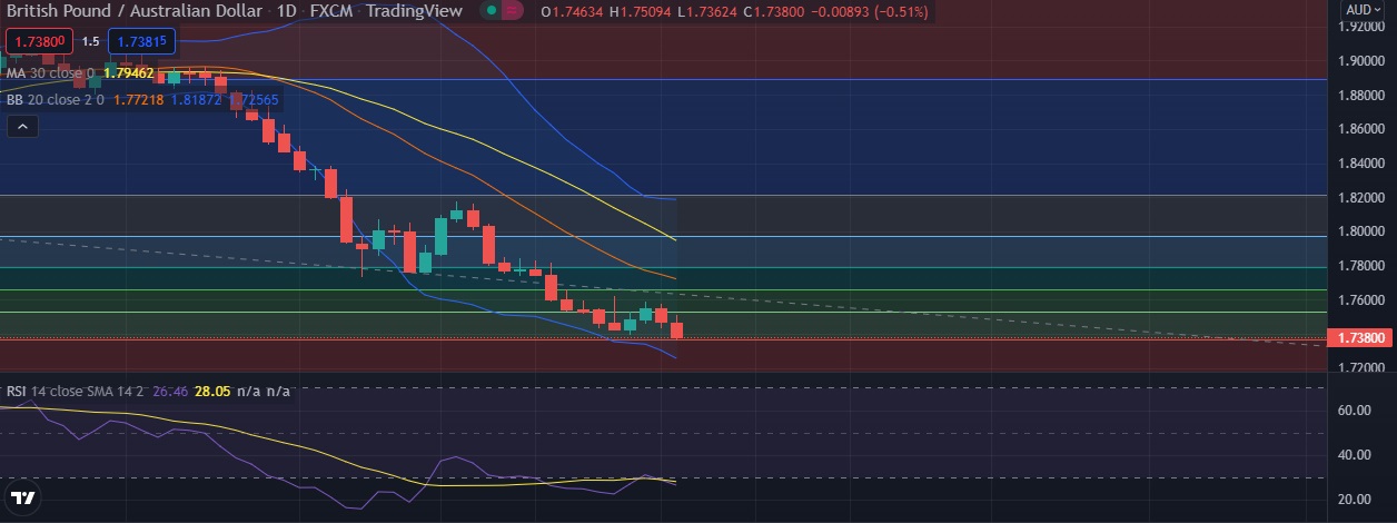 • Strong support is seen at 1.7360(23.6%fib ), and break below could take the pair towards 1.7256 (Lower BB).