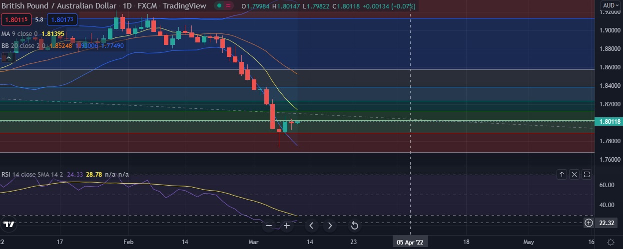 • Immediate support is seen at 1.7889 (23.6% fib) and break below could take the pair towards 1.7765 (Lower BB).