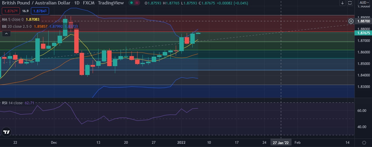 • Strong support is seen at 1.8708 (5 DMA) and break below could take the pair towards 1.8691 (38.2%fib).