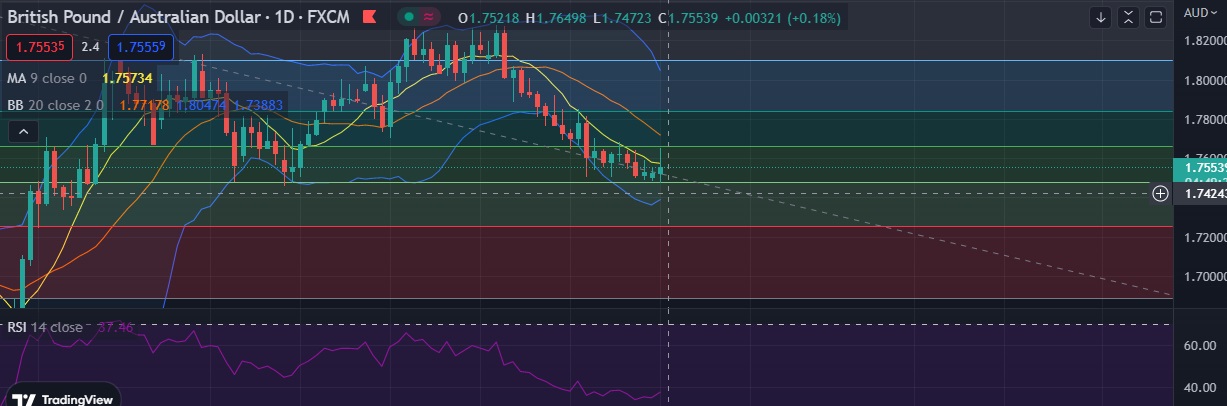 • Strong support is seen at 1.7484(38.2%fib) and break below could take the pair towards 1.7396 (Lower BB ).