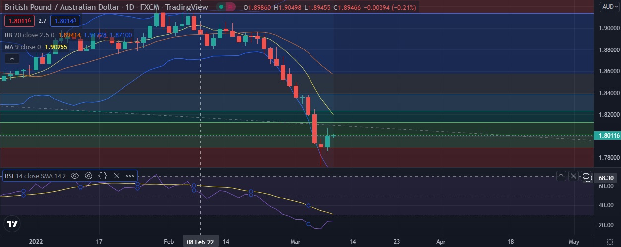 • Strong support is seen at 1.7890 (23.6%fib) and break below could take the pair towards 1.7789(Lower BB).