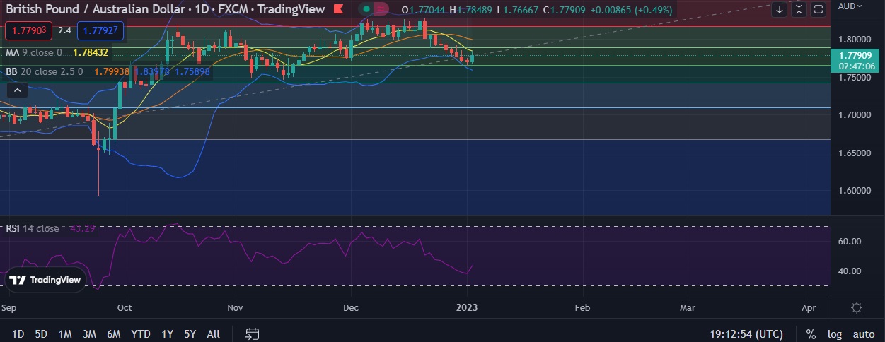 • Strong support is seen at 1.7659 (50%fib) and break below could take the pair towards 1.7597(Lower BB).