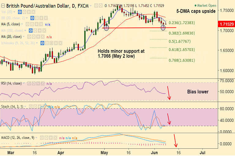 Support levels - 1.7100 (50-DMA), 1.7066 (May 2 low), 1.6983 (38.2% Fib of 1.5902 to 1.7650 rally)