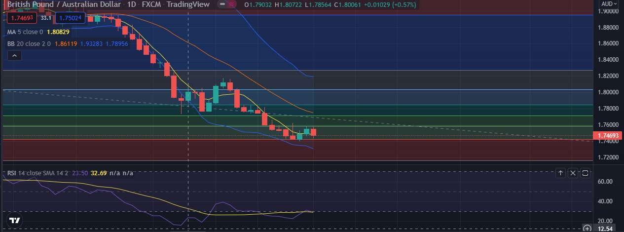 • Immediate support is seen at 1.7422 (23.6%fib) and break below could take the pair towards 1.7302 (Lower BB ).
