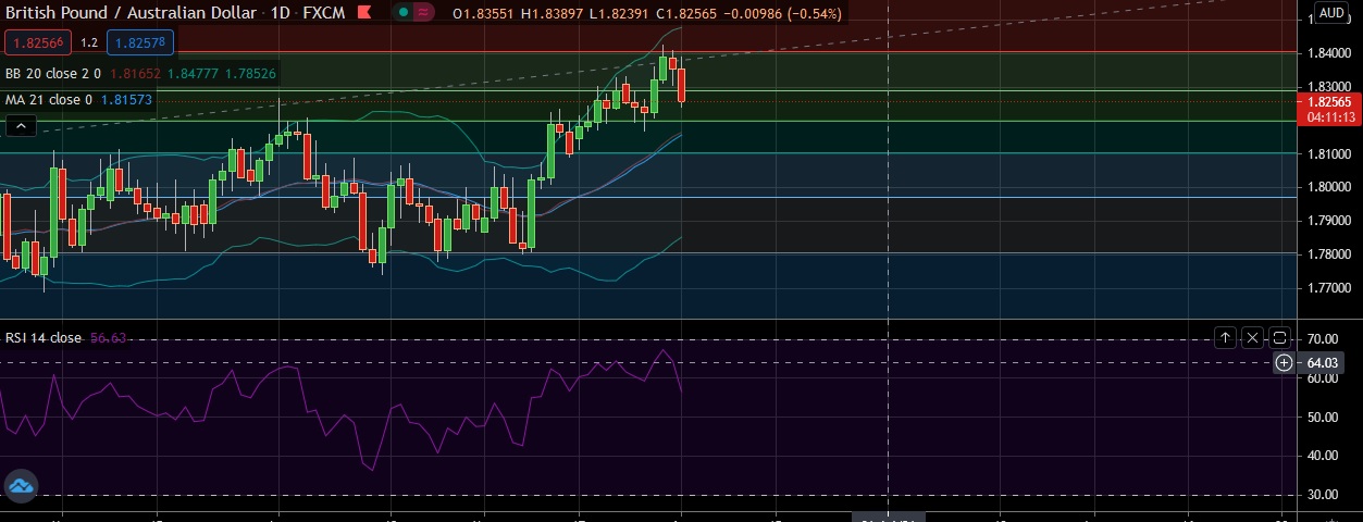 • GBP/AUD last traded at 1.8256, down 0.54% on the day, after hitting daily low at 1.8236.