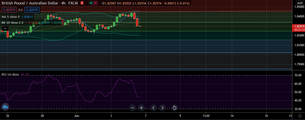 • Strong support is seen at 1.8248 (50%fib ), and break below could take the pair towards 1.8197 (Lower BB).