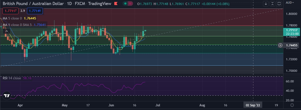 • Immediate support is seen at 1.7645 (5DMA) and break below could take the pair towards 1.7608(38.2%fib).