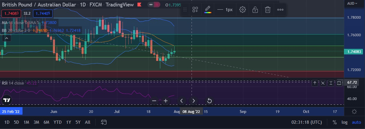 • The pair hit daily high at 1.7465 and was last trading at 1.7405. A break and daily close above 1.7479 (50%fib) will accelerate further gains.