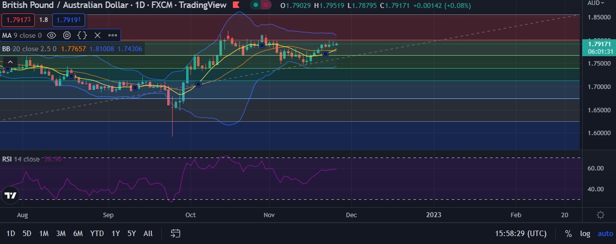 • Immediate resistance is located at 1.8000 (Psychological level), any close above will push the pair towards 1.8112 (Higher BB).