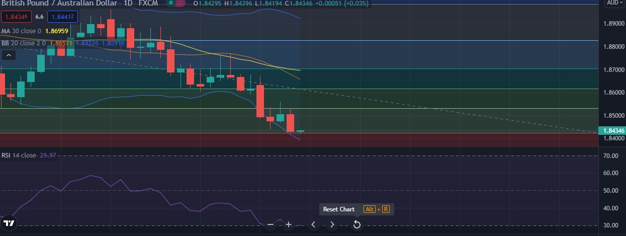 • Strong support is seen at 1.8421 (23.6%fib) and break below could take the pair towards 1.8390 (Lower BB).