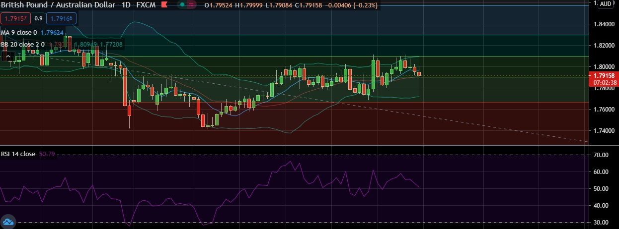 • Immediate support is seen at 1.7889 (38.2%fib ) and break below could take the pair towards 1.7711 (Lower BB ).
