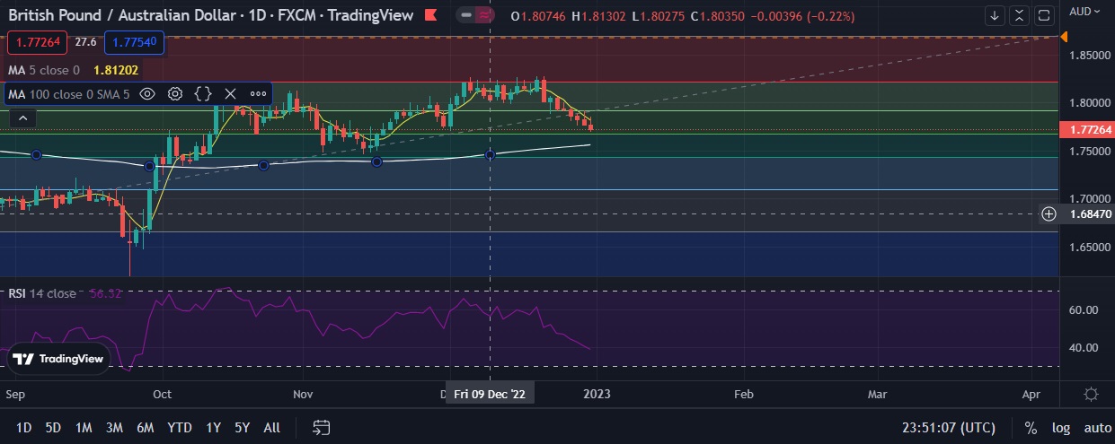 • The pairs falls below 5DMA has increased the growing bearish strength, putting focus on support at 1.7680 (50% fib).