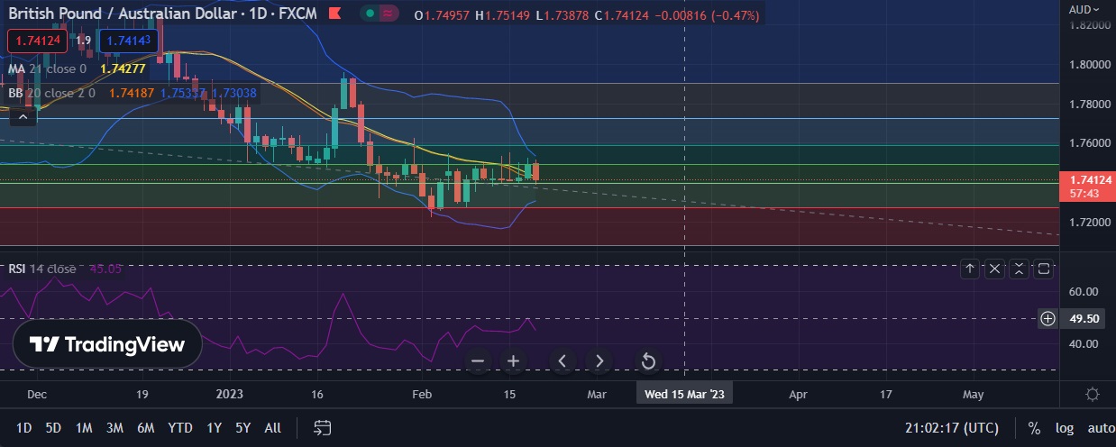 • Immediate support is seen at 1.7397 (38.2%fib) and break below could take the pair towards 1.7303(Lower BB).
