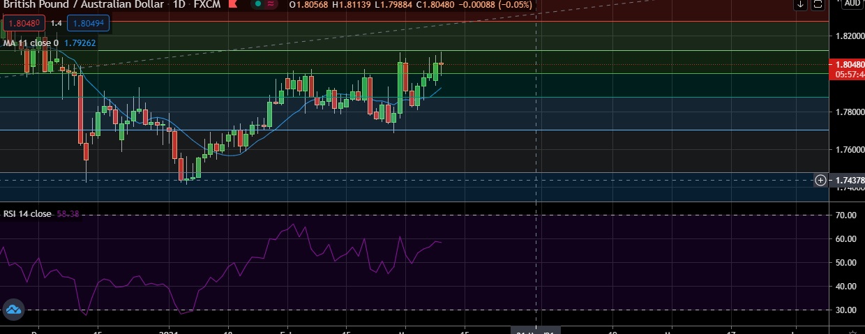 • GBP /AUD strengthened on Tuesday as sterling was supported by progress in Britain's vaccination programme and upbeat comments by BoE Governor Andrew Bailey.
