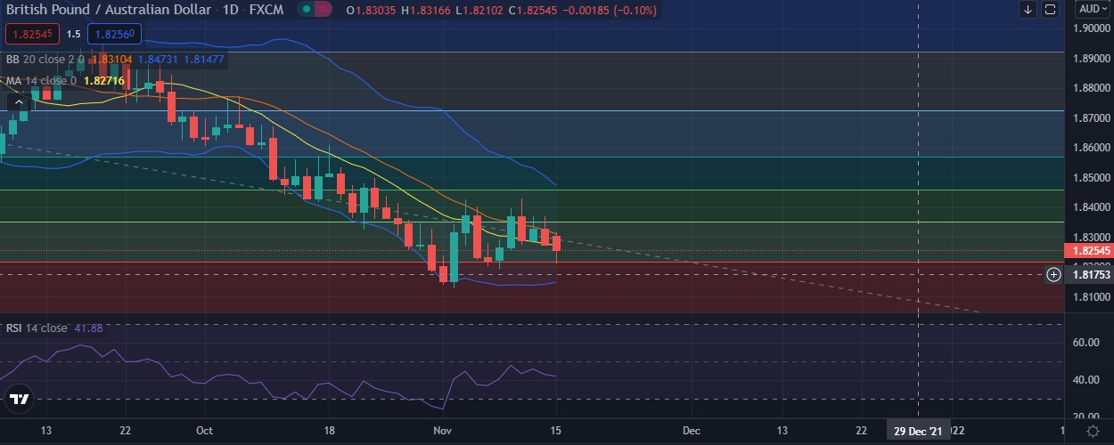 • Strong support is seen at 1.8217 (23.6%fib) and break below could take the pair towards 1.8148 (Lower BB).