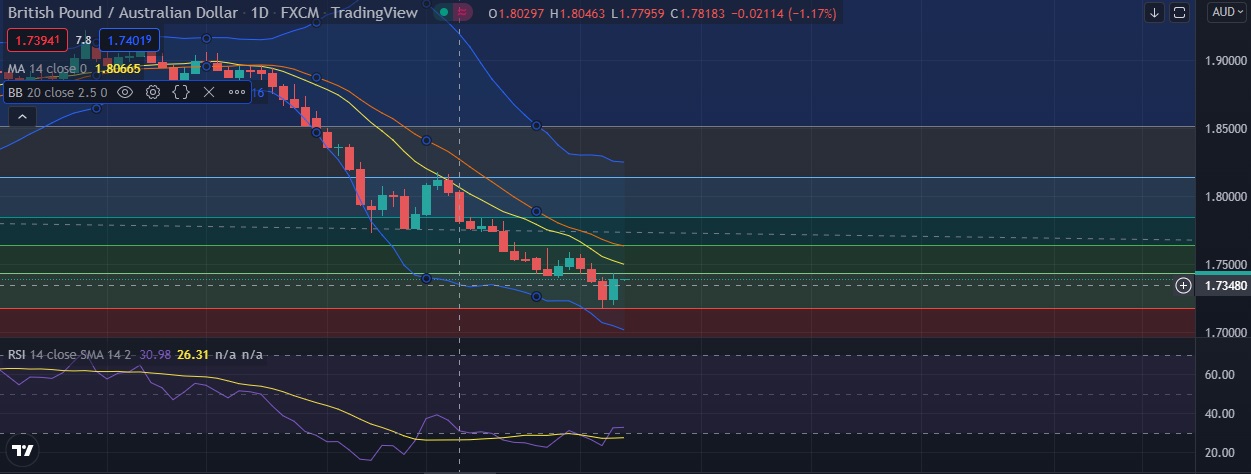 • Strong support is seen at 1.7179 (23.6%fib) and break below could take the pair towards 1.7024 (Lower BB).