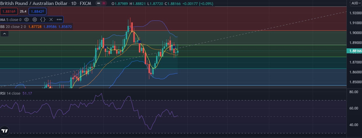 • The pair’s recovery stalled after finding resistance at 1.8873 (38.2%fib). GBP/AUD recent recovery attempts have been limited.