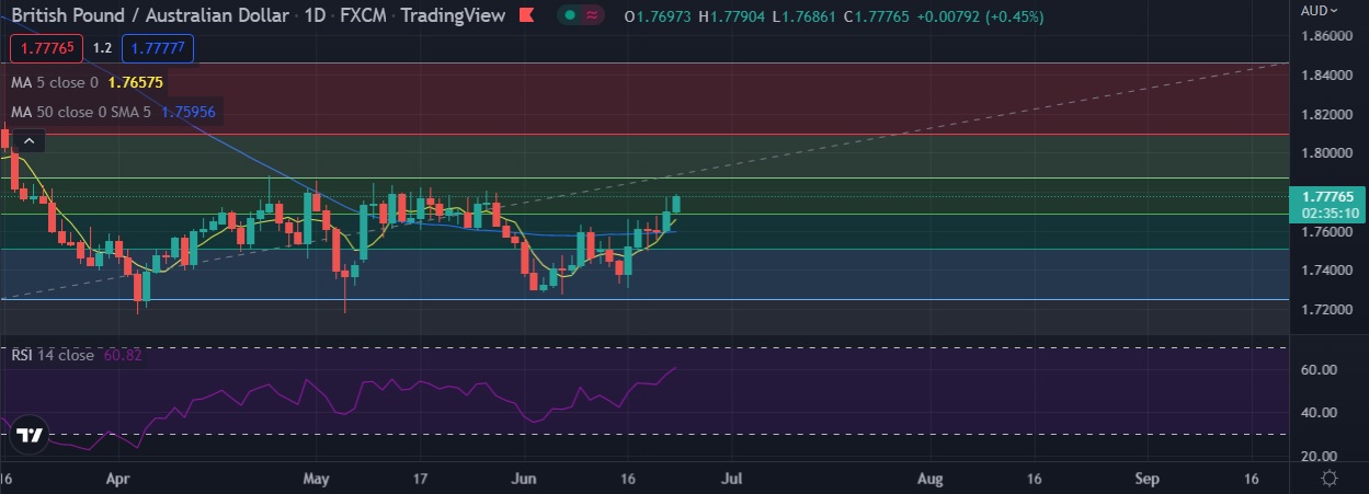 • Strong support is seen at 1.7692 (50%fib) and break below could take the pair towards 1.7663 (5DMA).