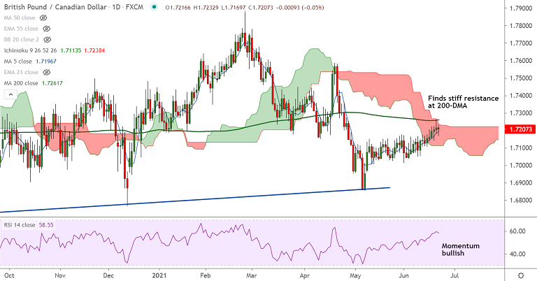 Summary: GBP/CAD has paused upside at 200-DMA. Technical studies support upside. Decisive break above 200-DMA will propel the pair higher.
