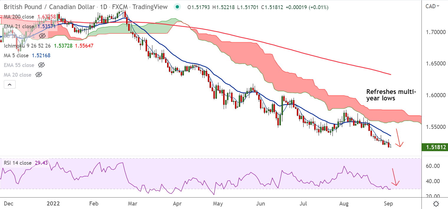 Summary: GBP/CAD trades with a strong bearish bias. The pair is poised to test fresh multi-year lows at 1.50 level.