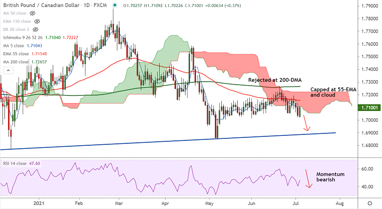 Summary: GBP/CAD trades with a bearish bias. However, the potential 'Bullish Engulfing' candle keeps scope for some upside. Daily cloud and 55-EMA offer stiff resistance. Major upside only on decisive break above.