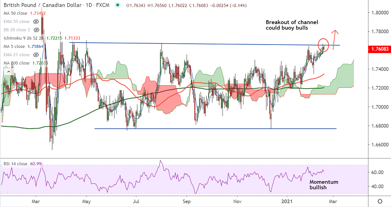 GBP/CAD was trading 0.15% lower on the day at 1.7608 at around 11:45 GMT, pauses 3 straight sessions of gains.