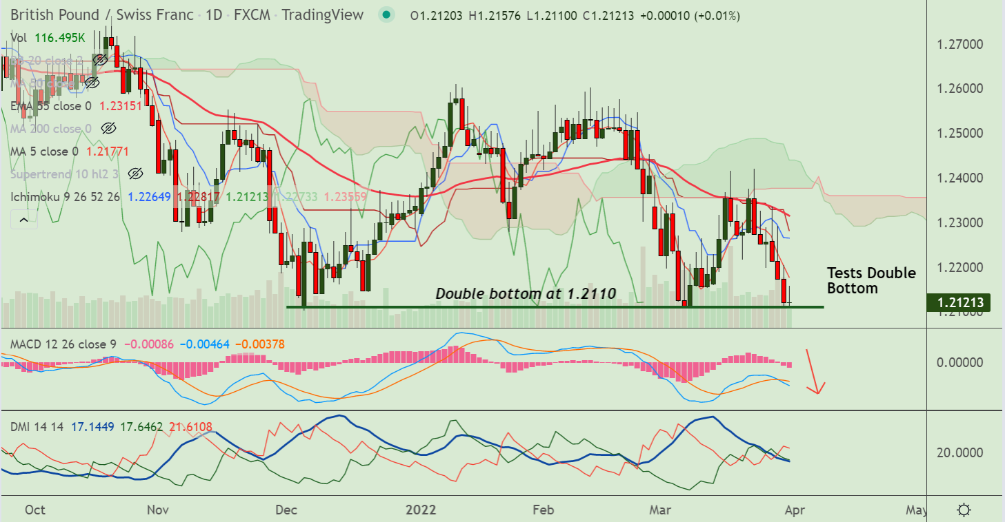 Summary: GBP/CHF poised for further downside. Watch out for break below Double Bottom at 1.2110 for downside continuation.