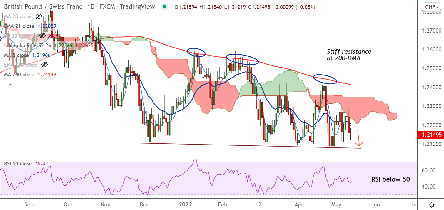GBP/CHF was trading 0.06% lower on the day at 1.2153 at around 10:10 GMT