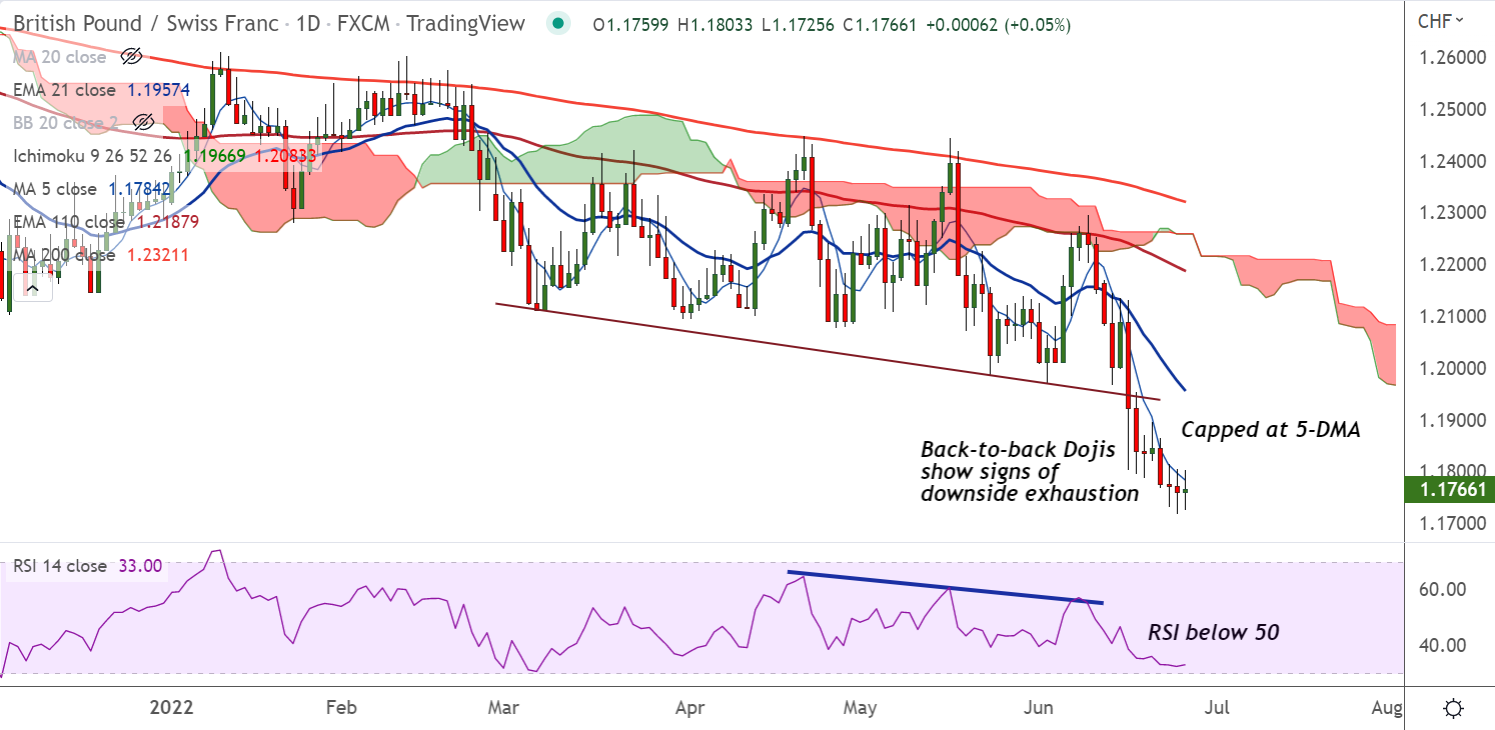 Summary: GBP/CHF extends sideways grind, shows signs of downside exhaustion. Major trend remains bearish. Upticks are likely to be limited.