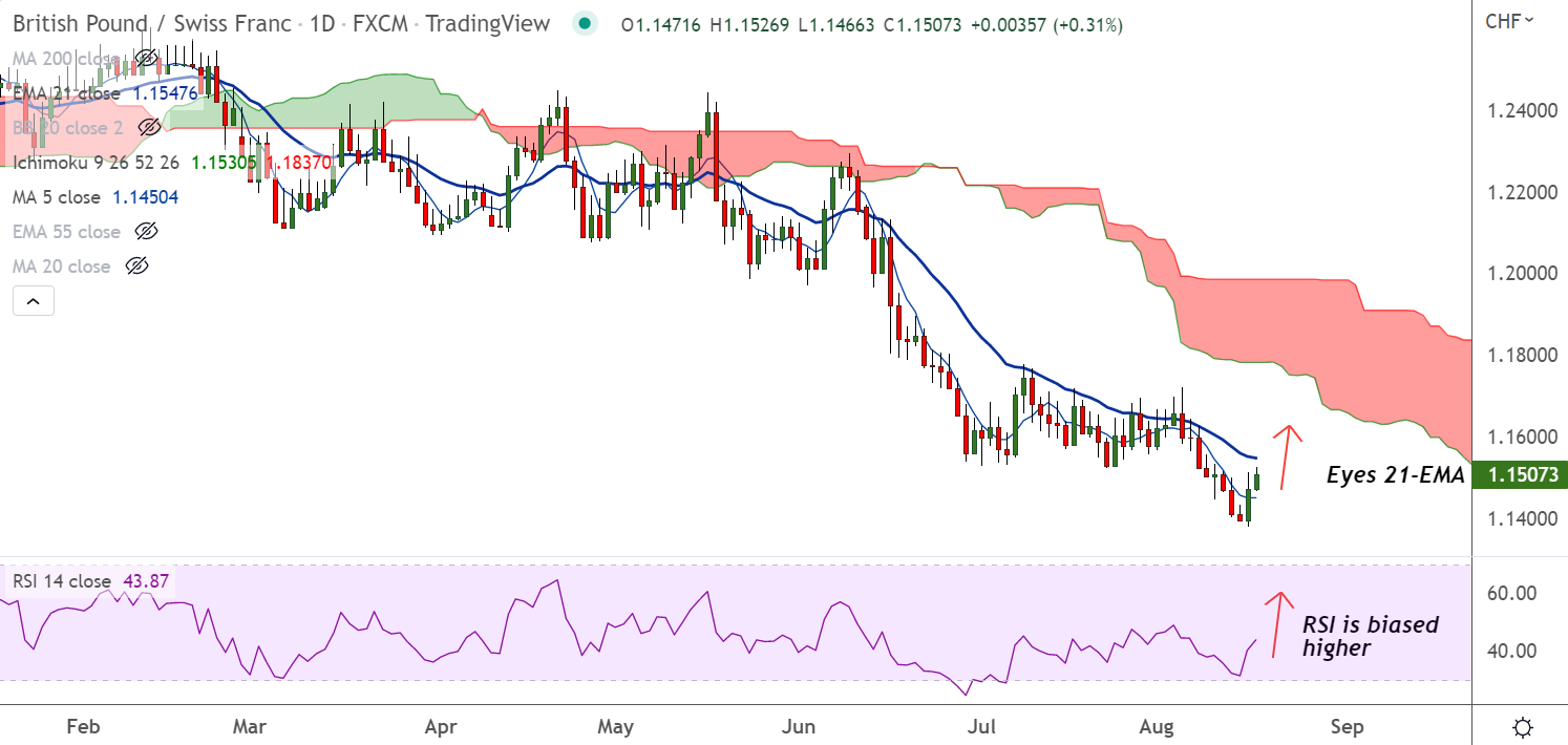 GBP/CHF poised for further upside. The pair eyes 21-EMA resistance at 1.1546. Decisive break above will fuel further gains.