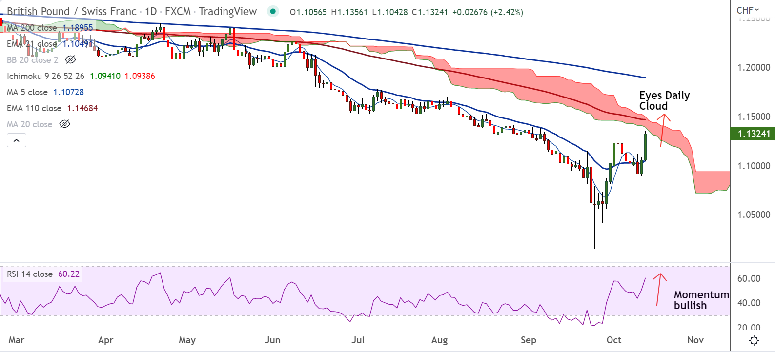 The pair has spiked past 21-EMA and is on track to test daily cloud, break above will see further upside.