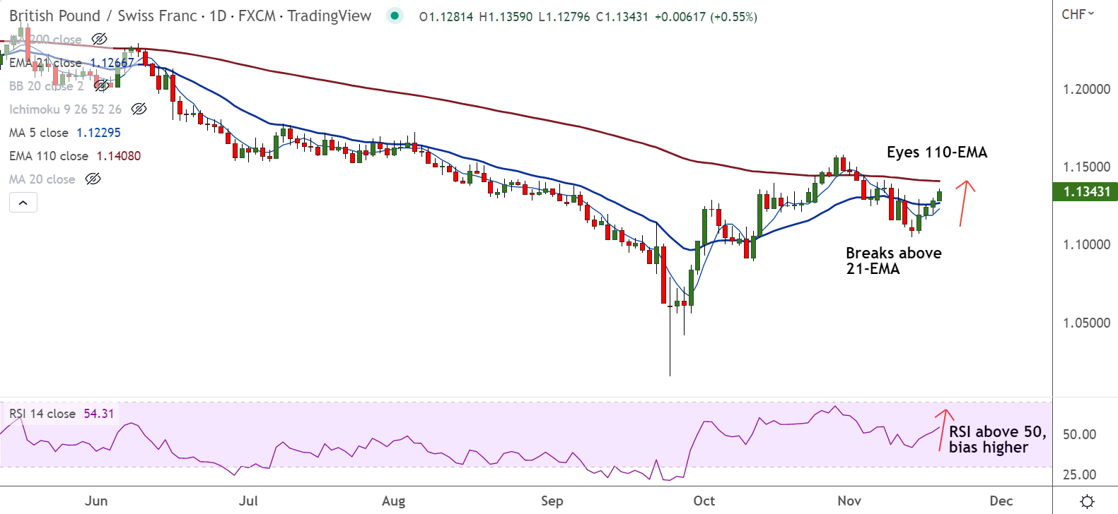GBP/CHF was trading 0.51% higher on the day at 1.1339 at around 10:30 GMT. The pair is extending gains for the 4th straight session, outlook is bullish.