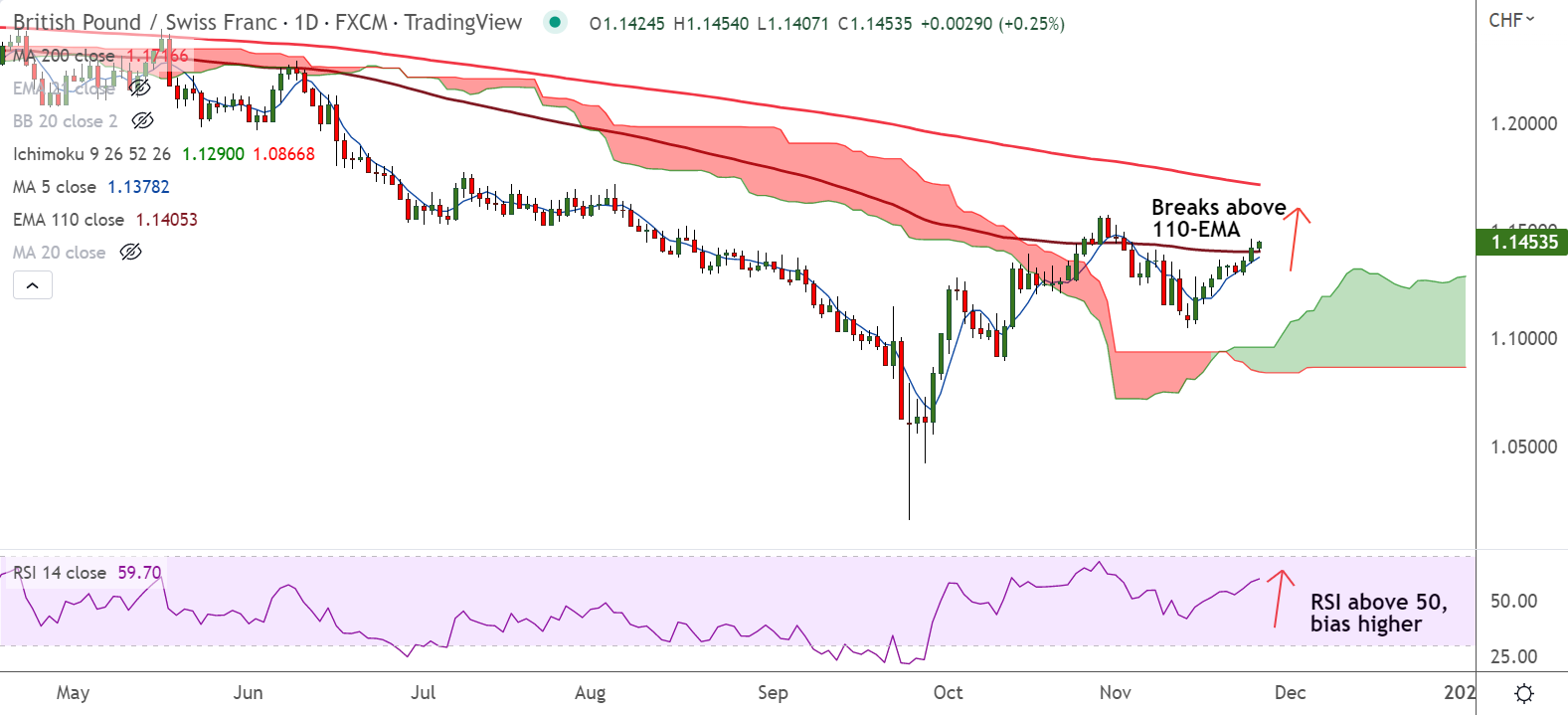 Summary: GBP/CHF breaks above 110-EMA raising scope for further upside. Next major resistance lies at 200-DMA at 1.1716.