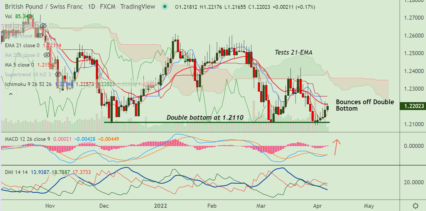 Summary: GBP/CHF was trading with a bullish bias. Price action has paused at 21-EMA, decisive break above will propel the pair higher.