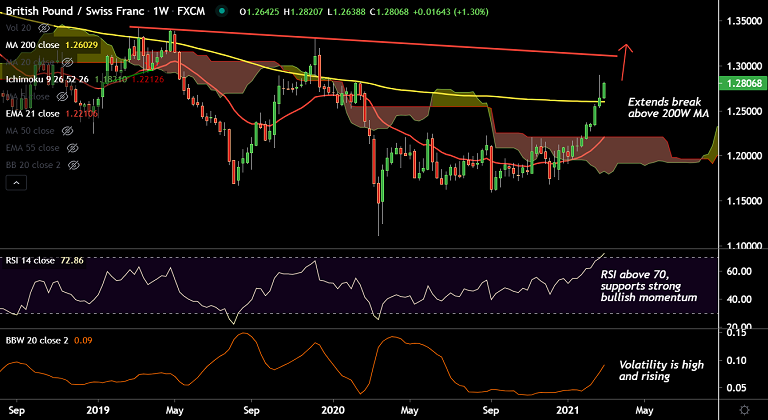 Summary: GBP/CHF has seen multiple rejection at 55-month EMA. The pair is currently testing resistance at 55-month EMA at 1.28. Decisive break above is required for upside continuation. Technical indicators support gains. Scope for test of 1.36 levels.